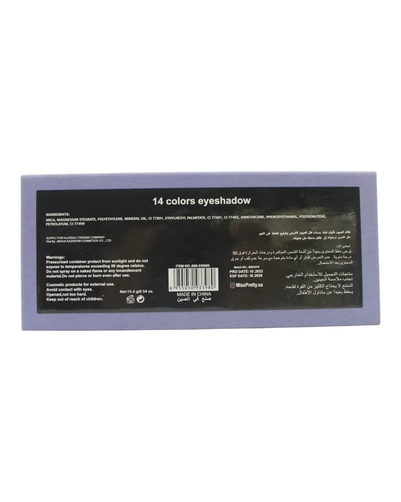 امنحي عيونك إطلالة جذابة مع لوحة ظلال العيون 14 لون من Miss Pretty. تركيبة كريمية فائقة النعومة تنساب بسهولة على الجفون، مما يمنحك ألوانًا غنية ونقية بلمسة حريرية.